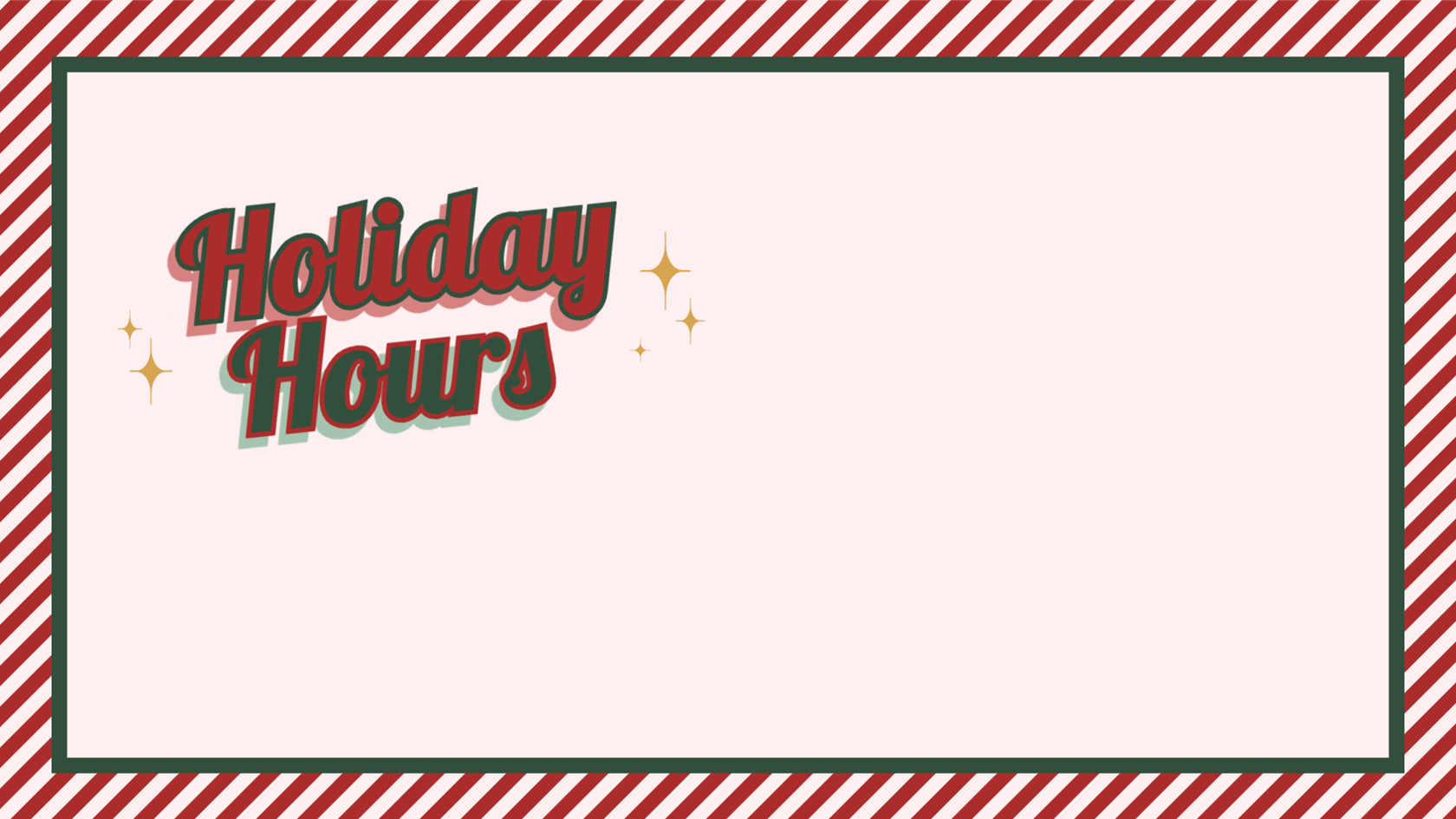 Happy holidays! We will be closed at 1 p.m. on Wednesday, December 24th. We will also be closed Thursday, December 25th and Thursday, January 1st.
